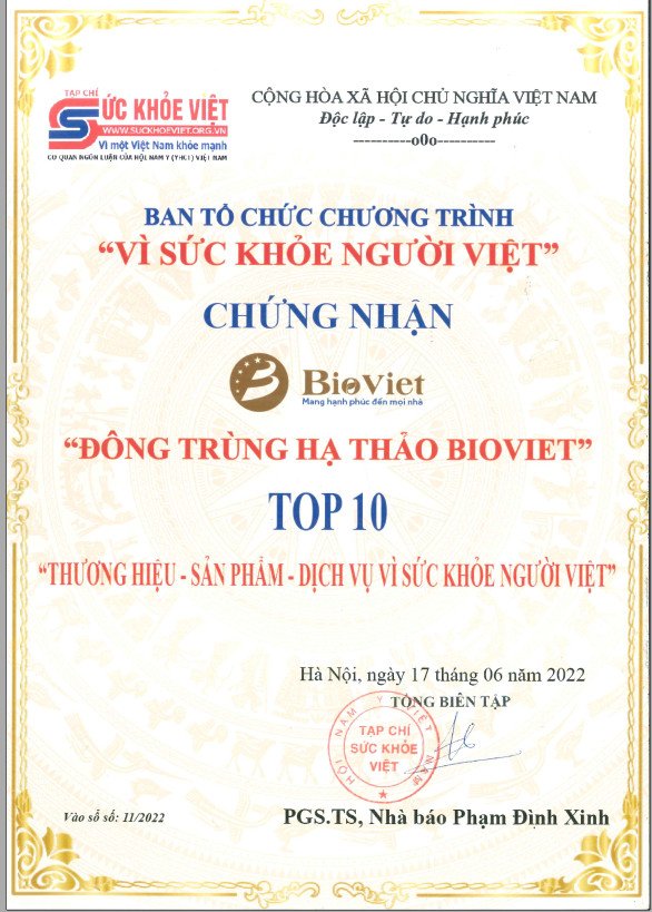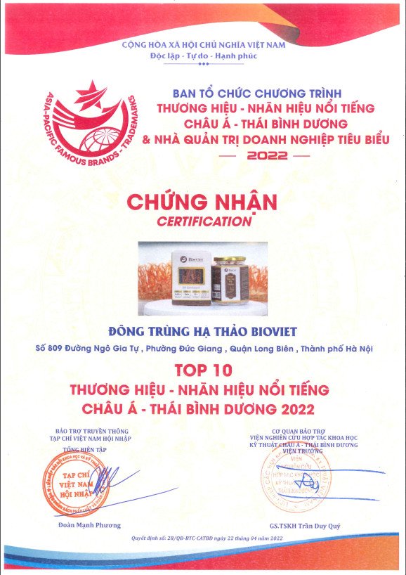 Nếu bạn không có điều kiện mua đông trùng hạ thảo Tây Tạng, hoàn toàn có thể thay thế bằng những loại trùng thảo nuôi trồng tại Việt Nam. Tuy nhiên thị trường đông trùng hạ thảo hiện nay khá phức tạp nên việc lựa chọn địa chỉ uy tín, chất lượng là rất quan trọng. Theo đó, ĐTHT BIOVIET là sản phẩm đạt tiêu chuẩn CHẤT LƯỢNG VÀNG VIỆT NAM do Đơn vị Bảo chứng và Chống hàng giả Việt Nam – Maxvalues Kiểm nghiệm và chứng nhận. Không chất Bảo quản, có hàm lượng chất quý hiếm