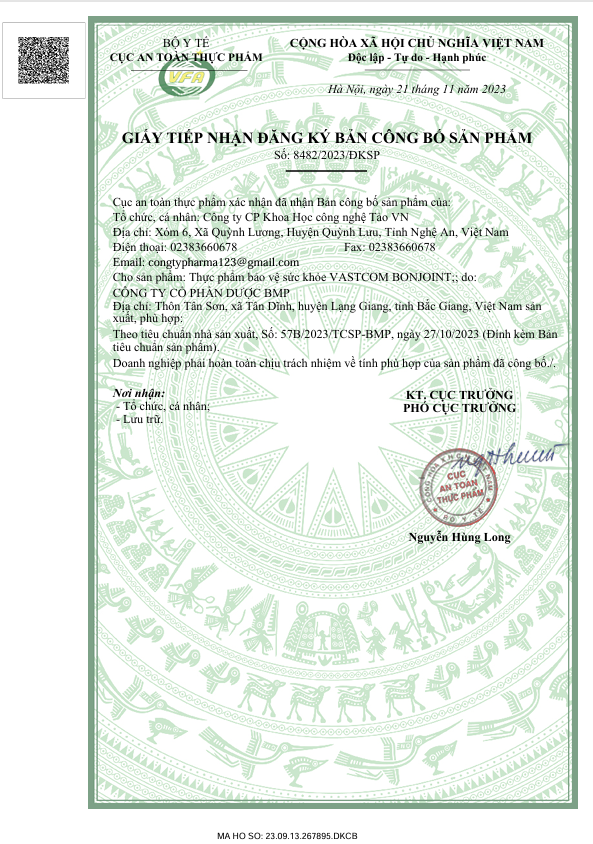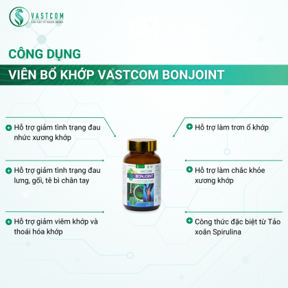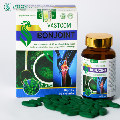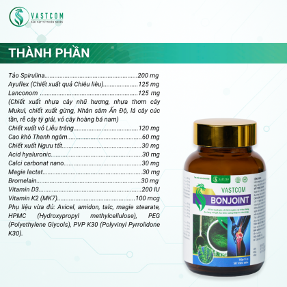 Sản phẩm VASTCOM Bonjoint là thực phẩm bảo vệ sức khỏe hỗ trợ xương khớp và bổ sung Canxi có nguồn gốc từ Tảo xoắn Spirulina, kết hợp cùng các chiết xuất dược liệu quý như Ayuflex, vỏ Liễu trắng, chiết xuất ngưu tất, Lanconone,… Sản phẩm được nghiên cứu để hỗ trợ giảm đau nhức, viêm khớp, thoái hóa khớp và làm trơn ổ khớp một cách an toàn, lành tính, phù hợp cho người cao tuổi, người vận động nhiều hoặc người có bệnh lý về khớp.
