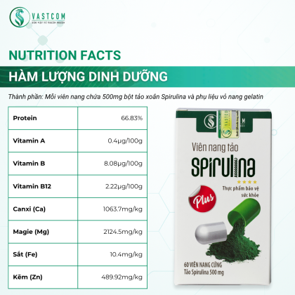 - Mỗi viên nang có chứa: Bột Tảo Spirulina nguyên chất: 500mg/viên (tổng 60 viên chứa khoảng 30.000mg).