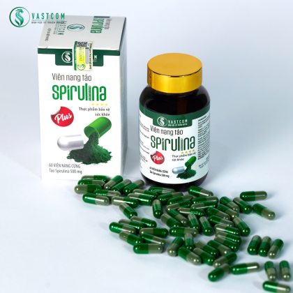 Sản phẩm Tảo xoắn viên nang Spirulina VASTCOM – Hộp 60 viên là thực phẩm bảo vệ sức khỏe có nguồn gốc thiên nhiên, được chiết xuất từ thành phần Tảo xoắn Spirulina. Với thành phần giàu Protein, Vitamin (A,B,C,D,E,PP,…), khoáng chất (Sắt, Kẽm, Magie, Canxi,…), các chất chống oxy hóa (Phycocyanin, Beta-caroten), Tảo xoắn Spirulina giúp tăng cường đề kháng, bổ sung dinh dưỡng, cải thiện tiêu hóa, cải thiện đường huyết, tốt cho tim mạch và phòng chống ung thư & đột quỵ, phù hợp với nhu cầu chăm sóc sức khỏe toàn diện.