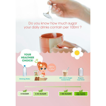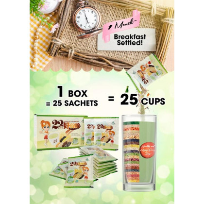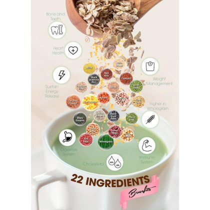 2. Thành phần: Hỗn hợp bột các loại hạt ngũ cốc (32.6%: gạo lứt, tấm ngô, đậu nành, gạo đỏ, đậu đỏ, lúa mạch, đậu xanh, đậu garbanzo, đậu nâu, hạnh nhân, hạt đậu que, hạt sen, đậu nành đen, hạt lúa mì, hạt kê hữu cơ, mè đen, nếp cẩm, hạt lanh hữu cơ), fructose (25.2%), kem không sữa (22%), chất xơ hòa tan fiber sol 2 (8%), bột malt (4%), bột yến mạch (2%), đạm đậu nành (2%), mầm lúa mì (1.6%), vỏ hạt mã đề (1.2%), tricalcium phosphate (0.92%), tinh chất mầm đậu nành (0.4%), diệp lục tố chlorophyll (0.04%), hương vanillin tự nhiên (0.04%).