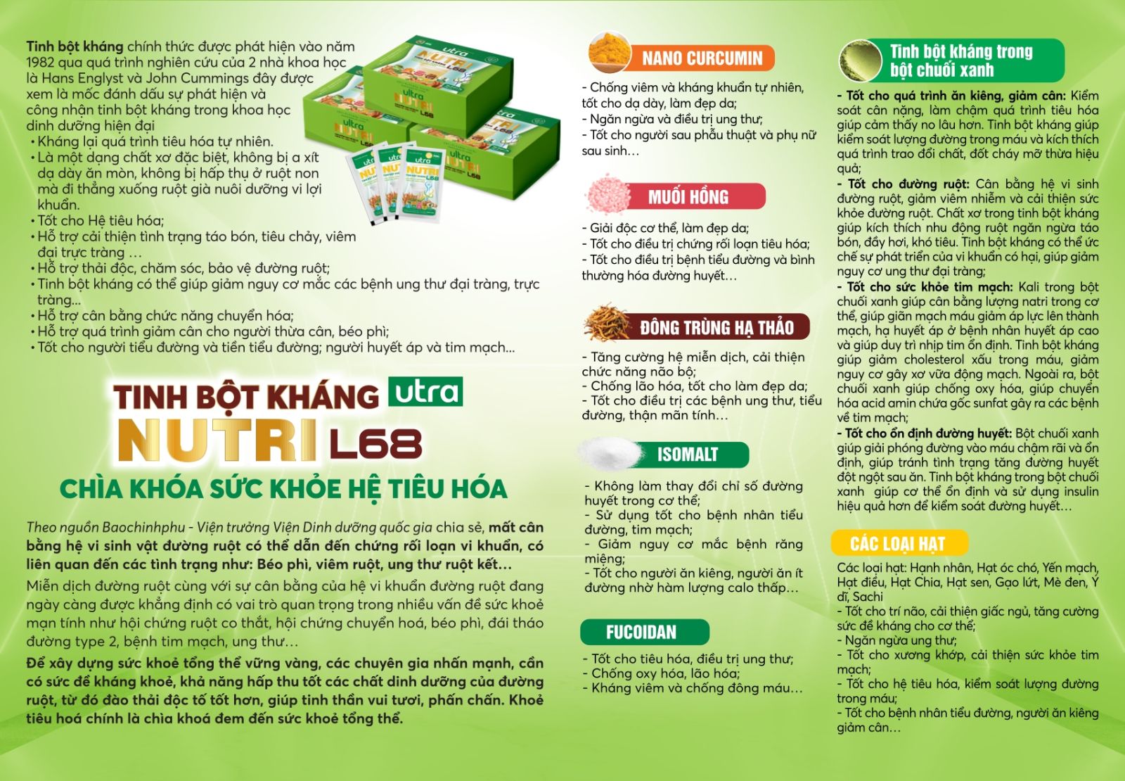 2. Thành phần: Các loại hạt (Hạnh nhân, Hạt óc chó, Yến mạch, Hạt điều, Hạt chia, Hạt sen, Gạo lứt, Mè đen, Ý dĩ, Sachi), Isomalt, Tinh bột kháng (từ bột chuối xanh), Nano Curcumin, Muối Hồng, Đông trùng hạ thảo (2000mcg/100g), Fucoidan (900 mcg/100g).